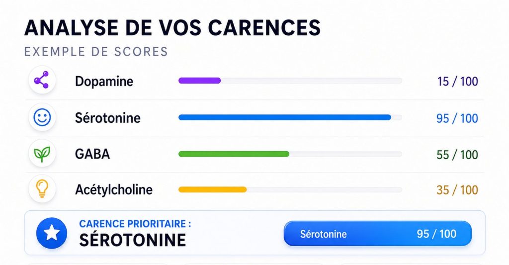 Ce bloc vous aide à comprendre votre terrain naturel, votre manière de fonctionner et le neurotransmetteur qui semble le plus structurer votre profil. Il permet d’identifier la base de votre équilibre neurochimique et de mieux voir quel neurotransmetteur mérite une attention particulière chez vous.